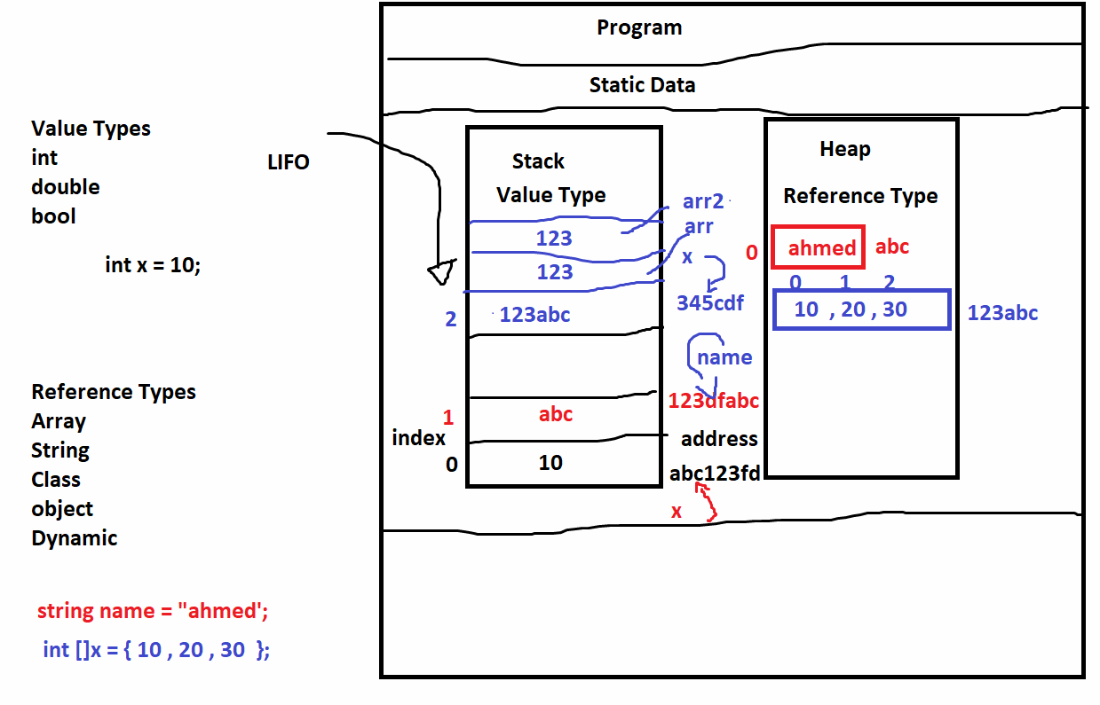 int,bool,struct). بتتخزن في الـ Stack (لو هي local variable) أو جوه الـ Object الأب اللي في الـ Heap. لما بتعمللها assignment بتتنقل بالـ Copy. مبتقبلش قيمةnull(إلا لو استخدمت Nullable Type). - الـ Reference Types: بتشيل الـ Address (عنوان) بيشاور على الـ Data اللي موجودة في الـ Heap (زي