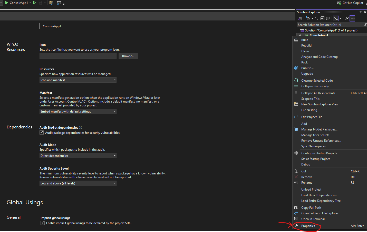 Propertieswindow. ุนุดุงู ุชูุชุญูุงุ ุฏูุณ ูููู ูู ูู ุนูู ุงููprojectุจุชุงุนู ูู ุงููSolution ExplorerูุงุฎุชุงุฑProperties.