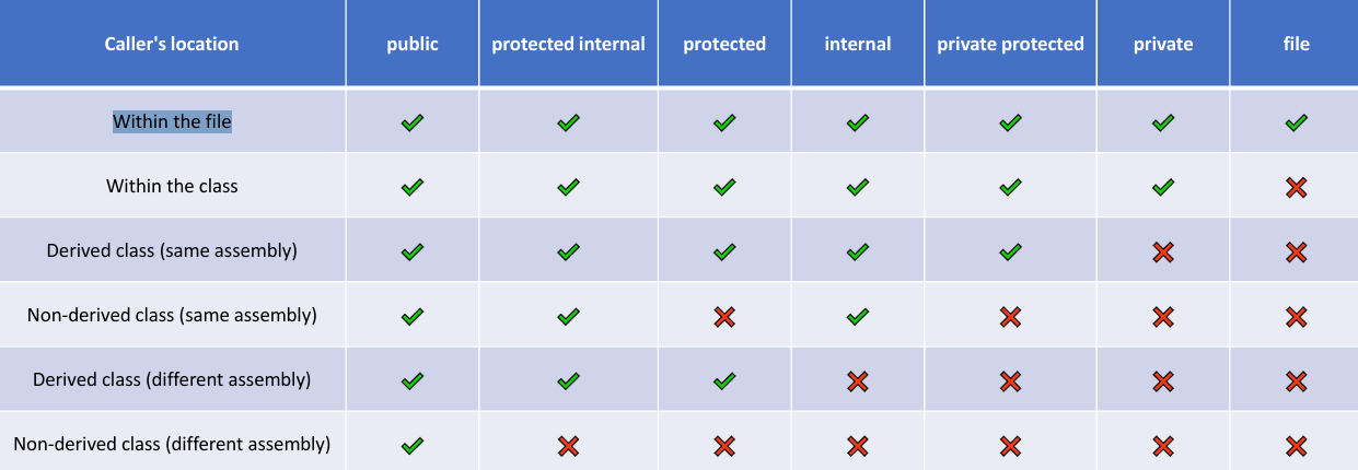 | Access Modifier | Inside Class | In Same Namespace | Inherited Class | Another Class |